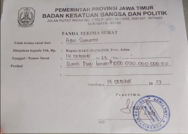 SURABAYA – Pada 14 Oktober 2023 Komite Anti Korupsi Indonesia (KAKI) mengajukan permohonan uang ganti rugi lahan kantor PDAM Surya Sembada Kota Surabaya dan Parkiran Daop VIII KAI Gubeng milik Alm Soeradji kepada Gubernur Jatim Khofifah Indar parawansa. Kemudian pada 17 Oktober 2023 mendapatkan rekomendasi dari Asisten Pemerintahan dan Kesejahteraan Rakyat ditujukan kepada Kepala Bakesbangpol Provinsi Jawa Timur Eddy Supriyanto.