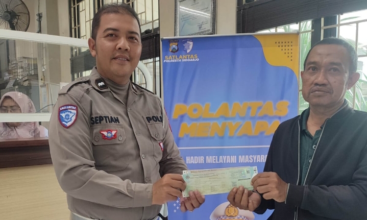 personel yang bertugas di pelayanan Samsat Sidoarjo Kota menyampaikan bahwa program Polantas Menyapa merupakan wujud nyata dari komitmen Polri dalam memberikan pelayanan yang profesional, humanis, dan transparan kepada masyarakat.